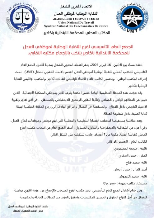 انعقد مساء يوم الاثنين 16 فبراير 2026، بمقر الاتحاد المغربي للشغل بمدينة أكادير ، الجمع العام التأسيسي للمكتب المحلي للنقابة الوطنية لموظفي العدل العضو بالاتحاد المغربي للشغل (UMT)، تحت إشراف المكتب الوطني ، و بحضور الكاتب العام للاتحاد الإقليمي لنقابات أكادير و المكتب الإقليمي للنقابة الوطنية بأكادير
