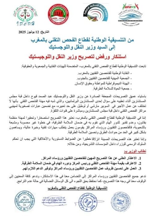 توصلت جريدة الجديد بريس ببلاغ من التنسيقية الوطنية لقطاع الفحص التقني بالمغرب تستنكر فيه وترفض تصريحات السيد وزير النقل واللوجيستك داخل قبة البرلمان هذا نصه :