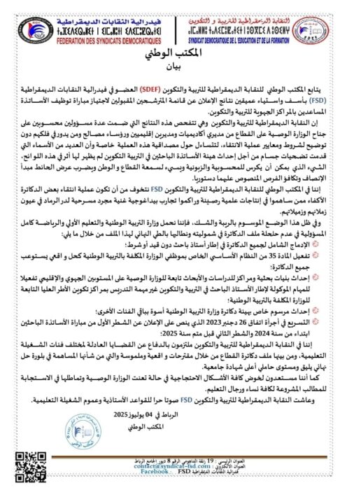 يتابع المكتب الوطني للنقابة الديمقراطية للتربية والتكوين (SDEF) العضو في فيدرالية النقابات الديمقراطية (FSD) بأسف واستياء عميقين نتائج الإعلان عن قائمة المترشحين المقبولين لاجتياز مباراة توظيف الأساتذة المساعدين بالمراكز الجهوية للتربية والتكوين.