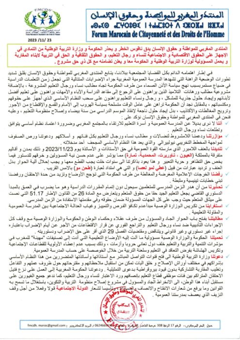 في إطار اهتمامه الدائم بكل القضايا المجتمعية ببلادنا، يتابع المنتدى المغربي للمواطنة وحقوق الإنسان بقلق شديد تطورات الوضعية الراهنة التي تشهدها المدرسة العمومية المغربية جراء الإضرابات المتتالية التي تجعل زمن التعلمات الدراسية في ضياع مستمربسبب نهج سياسة الأذن الصماء من طرف الحكومة تجاه مطالب نساء ورجال التعليم المشروعة ، بالإضافة مشروعية مطالب ورهانات التلاميذ الذين يراهنون على الرجوع إلى مقاعد الدراسة والآباء والأمهات يراهنون على تعليم أفضل لأبنائهم وإيجاد حلول جذرية للمشكل ، و رجال ونساء التعليم يراهنون على سحب النظام الأساسي الذي أجهز على حقوقهم ومكتسباتهم ، بالمقابل نجد أن الحكومة تراهن على عامل الوقت متسلحة بسياسة الهروب إلى الأمام والقمع والإقتطاع من الأجور وترويج المغالطات والأكاذيب ، بدل إيجاد حلول ناجعة لإنقاذ الموسم الدراسي من سنة بيضاء وإصلاح منظومة التعليم ، وعليه فنحن في المنتدى المغربي للمواطنة وحقوق الإنسان نؤكد على :