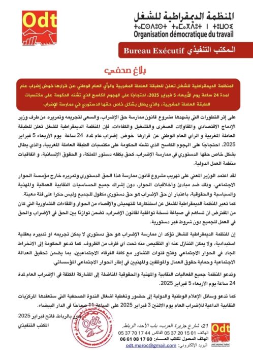 المنظمة الديموقراطية للشغل تقرر خوض اضراب وطني يوم 05 فبراير 2025 احتجاجا على هجوم الحكومة على مكتسبات الطبقة العاملة