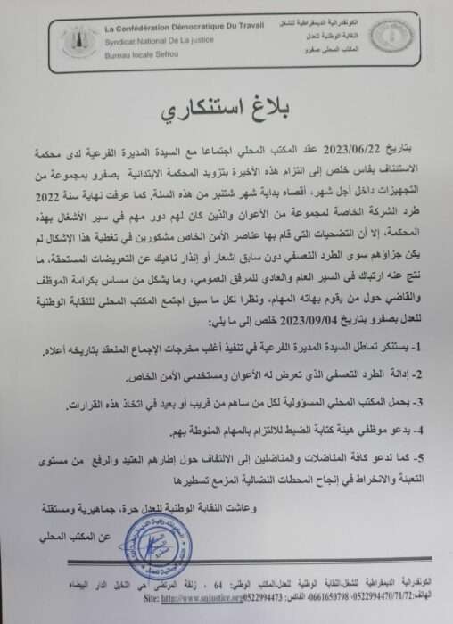 بتاريخ 22/06/2023 عقد المكتب المحلي اجتماعا مع السيدة المديرة الفرعية لدى محكمة الاستئناف بفاس خلص الى إلتزام هذه الاخيرة بتزويد المحكمة الإبتدائية بصفرو بمجموعة من التجهيزات داخل اجل شهر، أقصاه بداية شهر شتنبر من هذه السنة .كما عرفت نهاية سنة 2022 طرد الشركة الخاصة لمجموعة من الأعوان والدين كان لهم دور مهم في سير الاشغال بهده المحكمة .الا ان التضحيات التي قام بها عناصر الامن الخاص مشكورين في تغطية هذا الاشكال لم يكن جزاؤهم سوى الطرد التعسفي دون سابق اشعار او انذار ناهيك عن التعويضات المستحقة .ما نتج عنه ارتباك في السير العام والعادي للمرفق العمومي .ومايشكل من مساس بكرامة الموظف والقاضي حول من يقوم بهاته المهام ونظرا لكل ماسبق اجتمع المكتب المحلي للنقابة الوطنية للعدل بصفرو وبتاريخ 04/0/2023 خلص الى مايلي: