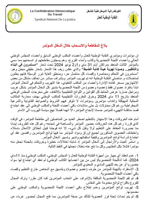 إن مؤتمرات ومؤتمري النقابة الوطنية للعدل وأعضاء المكتب الوطني السابق وأعضاء المجلس الوطني الحالي وأعضاء اللجنة التحضيرية وكتاب وأمناء الفروع، وهم يسجلون مقاطعتهم او انسحابهم مما سمي بالمؤتمر الثالث المنعقد بمراكش أيام 31 ماي و1و2 يونيو 2024 تحت شعار “مستمرون في البناء والتنظيم… وصونا لهوية هيئة كتابة الضبط” والذي عكس زيف هذا الشعار بشعار حقيقي مبطن وهو: “مستمرون في التحكم ومحاصرة وإقصاء كل مناضل حر، وبمنطق الغاية تبرر الوسيلة فإنهم يعلنون لمناضلات و مناضلي النقابة الوطنية انه تم تهريب المؤتمر وبإشراف مباشر من تحالف مشكل من بعض الانتهازيين مسخر لفائدة الإدارة وأعضاء من المكتب التنفيذي، هذا التهريب والتحكم في أشغال المؤتمر ابتدأ بانفراد عضوان فقط (عضوة وعضو) من اللجنة التحضيرية بتدبير كل أشغال المؤتمر بشكل غريب ومرتجل ضاربا عرض الحائط كل القوانين و اللوائح التنظيمية بالالتفاف على مخرجات المجلس الوطني المنعقد بتاريخ 11 ماي 2024 وخرق المقررات التنظيمية للمكتب الوطني بهدف محاربة المكاتب المحلية المهيكلة وانتداب مؤتمرين ومؤتمرات لا تتوفر فيهم الشروط والضوابط القانونية والشرعية الديمقراطية ورغم كل محاولات بل حتى مناشدات باقي أعضاء اللجنة والمكتب الوطني إلى عقد اجتماع قصد مناقشة التهييء للمؤتمر ضمانا لإنجاح المؤتمر، الا انهما فضلا نهج سياسة الهروب الى الامام.