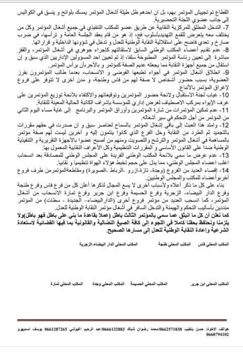 8- عدم تقديم أعضاء المكتب الوطني السابق لاستقالتهم كإجراء جوهري في أشغال المؤتمر، والقفز مباشرة إلى تعيين رئاسة المؤتمر المطبوخة سلفا، إذ تم تعيين احد المسؤولين الإداريين الذي سبق و إن استقال من جميع أجهزة النقابة مما يجعله عديم الصفة كمؤتمر و بالأحرىأن يرأس المؤتمر.
