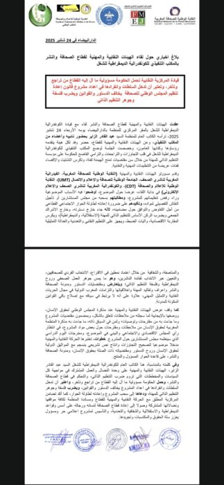 عقدت الهيئات النقابية والمهنية لقطاع الصحافة والنشر لقاء مع قيادة الكونفدرالية الديمقراطية للشغل بالمقر المركزي للمنظمة بالدارالبيضاء يومه الأربعاء 24 شتنبر 2025، ترأسه الكاتب العام للمنظمة السيد عبد القادر الزاير بحضور نائبيه وأعضاء من المكتب التنفيذي، وعن الهيئات النقابية والمهنية للقطاع، حضر وفد لكل هيئة يتقدمه رؤساؤها وكتابها العامون، وخصصت الجلسة لوضع المكتب التنفيذي للكونفدرالية الديمقراطية للشغل في قلب التجاوزات والتراجعات والترامي الفاضح للحكومة على مؤسسة التنظيم الذاتي للمهنة من خلال سن مقتضيات تمنح الهيمنة لفئة، وتكرس التشتيت والإقصاء لفئات عريضة من التنظيمات المهنية والنقابية.