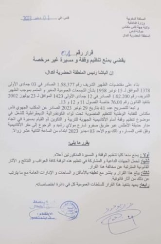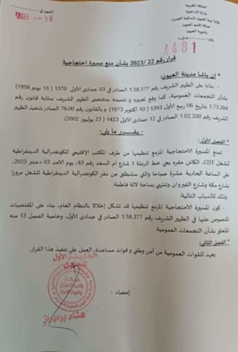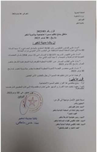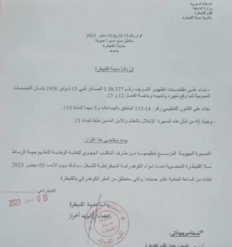 وتتذرع مصالح وزارة الداخلية بكون المسيرات الاحتجاجية المقرر تنظيمها تشكل “إخلالا بالنظام العام”، متوعدة المخالفين لعدم الامتثال لقرار المنع بعواقب.