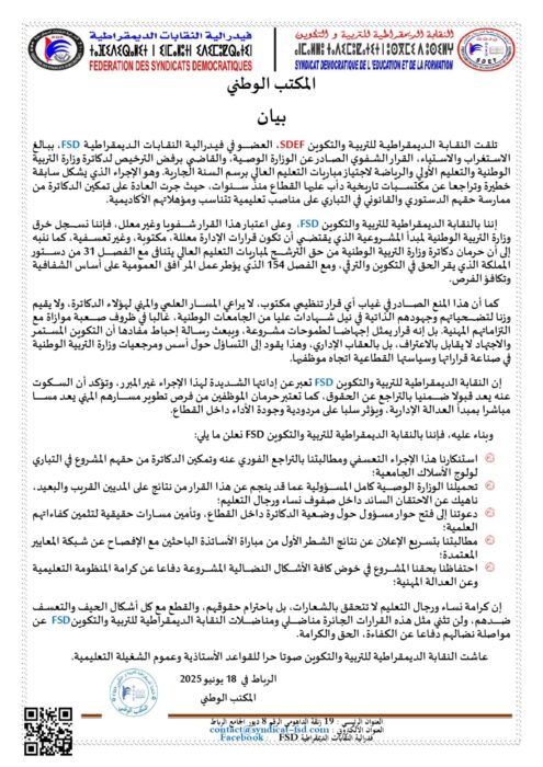 إن النقابة الديمقراطية للتربية والتكوين FSD تعبر عن إدانتها الشديدة لهذا الإجراء غير المبرر، وتؤكد أن السكوت عنه يعد قبولا ضمنيا بالتراجع عن الحقوق، كما تعتبر حرمان الموظفين من فرص تطوير مسارهم المهني يعد مسا مباشرا بمبدأ العدالة الإدارية، ويؤثر سلبا على مردودية وجودة الأداء داخل القطاع.