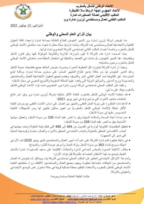 رداً على بيان نقابة الاتحاد الوطني للشغل بالمغرب بشأن شركة أوزون تمارة برو: “تجار الأزمات.. لا مكان لكم بين عمال أوزون”