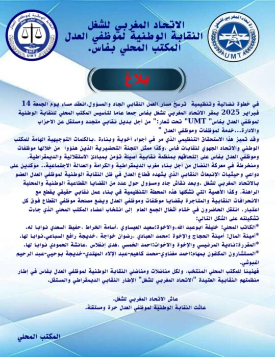 في خطوة نضالية وتنظيمية ترسخ مسار العمل النقابي الجاد والمسؤول،انعقد مساء يوم الجمعة 14 فبراير 2025 بمقر الاتحاد المغربي للشغل بفاس جمعا عاما لتأسيس المكتب المحلي للنقابة الوطنية لموظفي العدل بفاس” UMT” تحت شعار:” من أجل بديل نقابي متجدد ومستقل عن الاحزاب والادارة…خدمة لموظفات وموظفي العدل ”