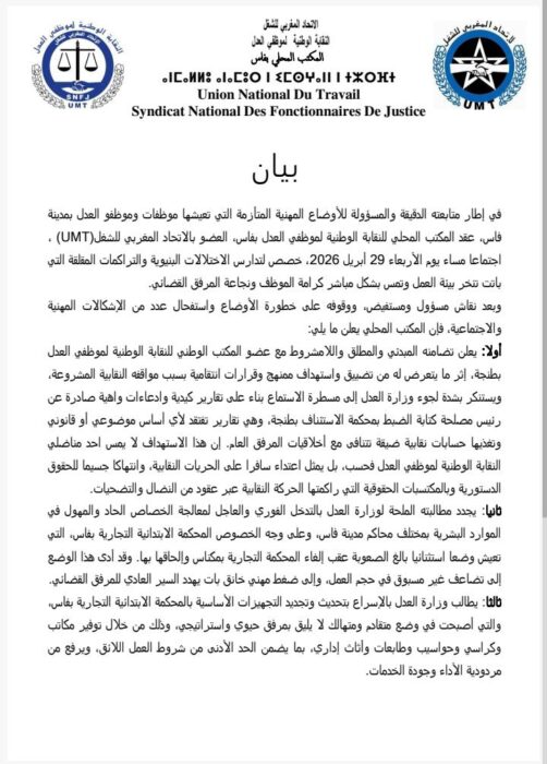 في إطار متابعته الدقيقة والمسؤولة للأوضاع المهنية المتأزمة التي تعيشها موظفات وموظفو العدل بمدينة فاس، عقد المكتب المحلي للنقابة الوطنية لموظفي العدل بفاس، العضو بالاتحاد المغربي للشغل (UMT)، اجتماعا مساء يوم الأربعاء 29 أبريل 2026، خصص لتدارس الاختلالات البنيوية والتراكمات المقلقة التي باتت تنخر بيئة العمل وتمس بشكل مباشر كرامة الموظف ونجاعة المرفق القضائي.