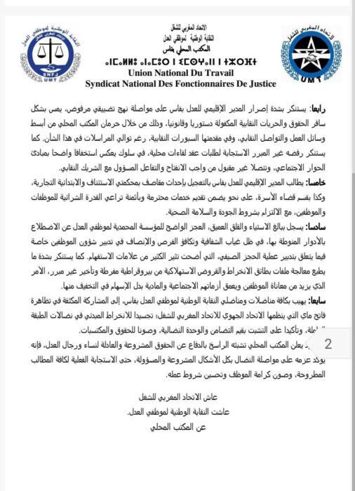 _رابعا:يستنكر بشدة إصرار المدير الإقليمي للعدل بفاس على مواصلة نهج تضييقي مرفوض، يمس بشكل سافر الحقوق والحريات النقابية المكفولة دستوريا وقانونيا، وذلك من خلال حرمان المكتب المحلي من أبسط وسائل العمل والتواصل النقابي، وفي مقدمتها السبورات النقابية، رغم توالي المراسلات في هذا الشأن. كما يستنكر رفضه غير المبرر الاستجابة لطلبات عقد لقاءات محلية، في سلوك يعكس استخفافا واضحا بمبادئ الحوار الاجتماعي، وتنصلا غير مقبول من واجب الانفتاح والتفاعل المسؤول مع الشريك النقابي.